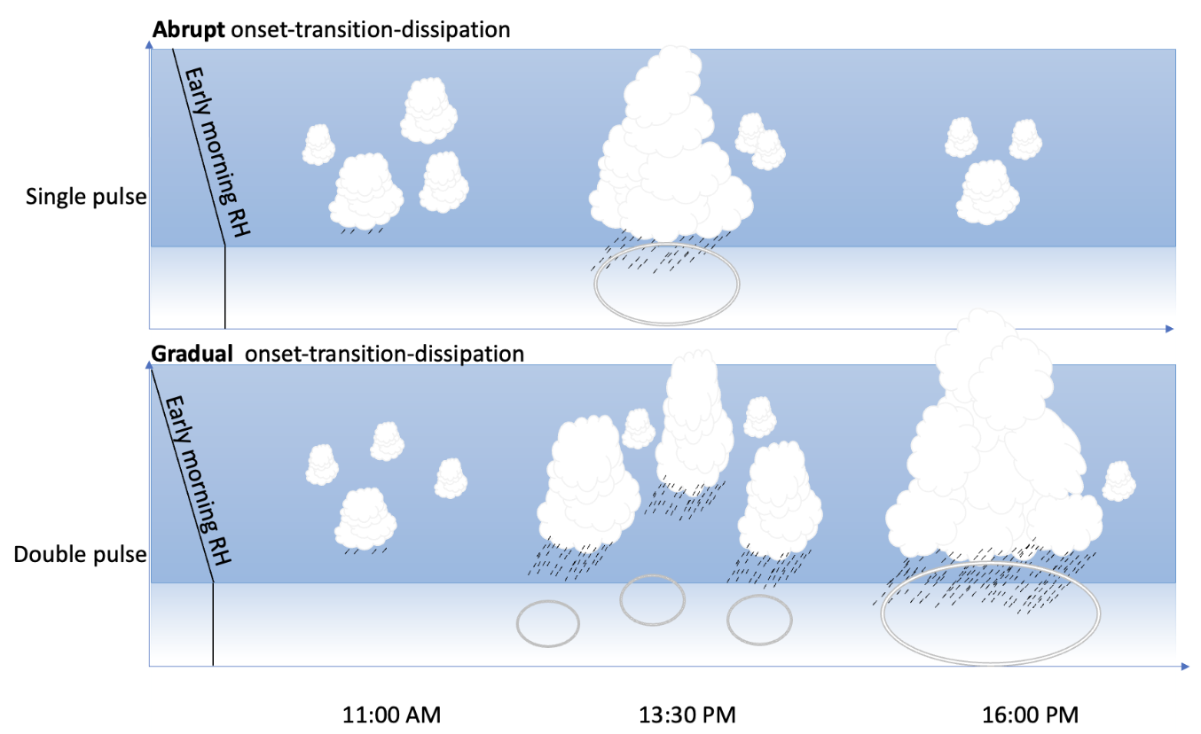 Fig 1. A schematic that demonstrates the mechanism behind single- vs double- pulse of precipitation. In single-pulse days, early morning RH is high, and the transition from shallow to deep is abrupt, whereas in double-pulse days, a slow transition that features congestus formation pre-moistens the atmosphere to allow for convection to sustain. (Tian and Zhang 2025)